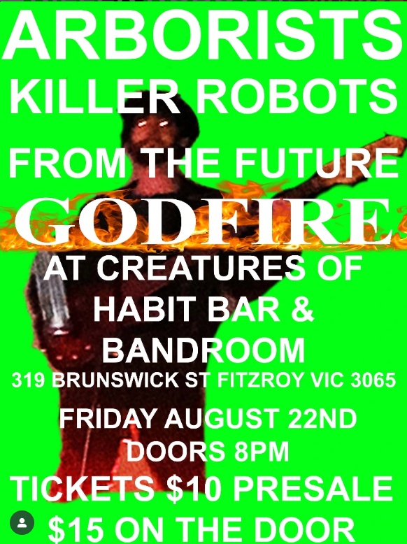 ARBORISTS return to the hallowed halls of CREATURES OF HABIT BAR & BANDROOM for the VERY FIRST TIME, to render order from chaos with their inimicable brand of funky SLEDGEHAMMER PUNK. Esteemed guests the KILLER ROBOTS FROM THE FUTURE (possibly evil) join to lend their unique blend of grunge, punk and machinery with glowing red eyes, and the incredibly wise GODFIRE rounds out the lineup of heavy HEAVY HITTERS - THIS IS A NIGHT NOT TO BE MISSED BY HUMAN OR CLANKER!!!