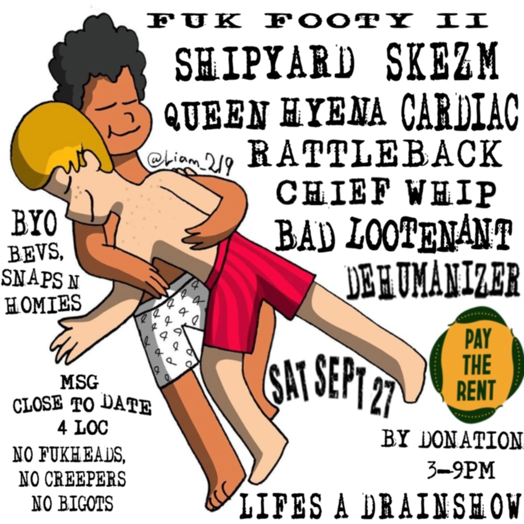 Pay The Rent by donation, Arvo_early evening show w Cardiac, Skezm, Shipyard, Chief Whip, Queen Hyena, Bad Lootenant, Dehumanizer.