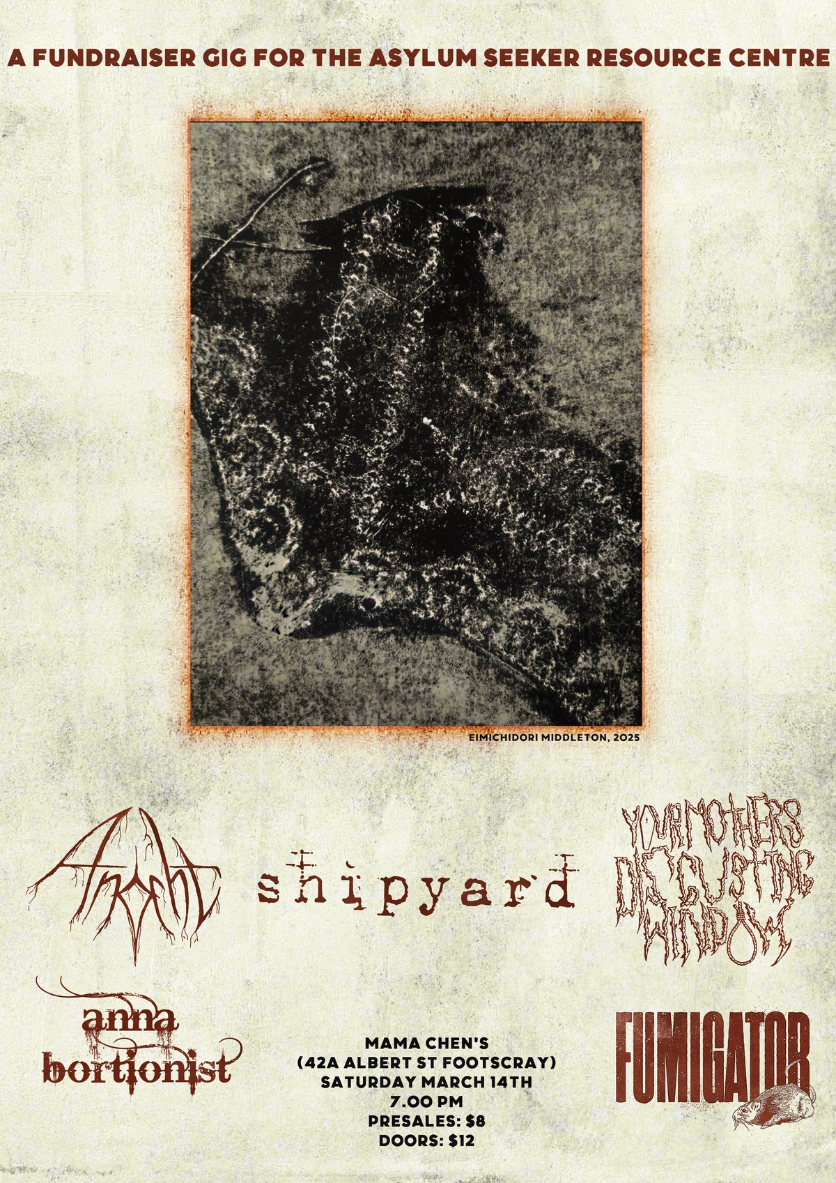 Fundraiser gig for The Asylum Seeker Refugee Centre (ASRC). Join us at Mamma Chen's in Footscray on March 14th for some heavy hitters in Naarm's underground and heavy music scene making some truly ugly noise for a great cause.