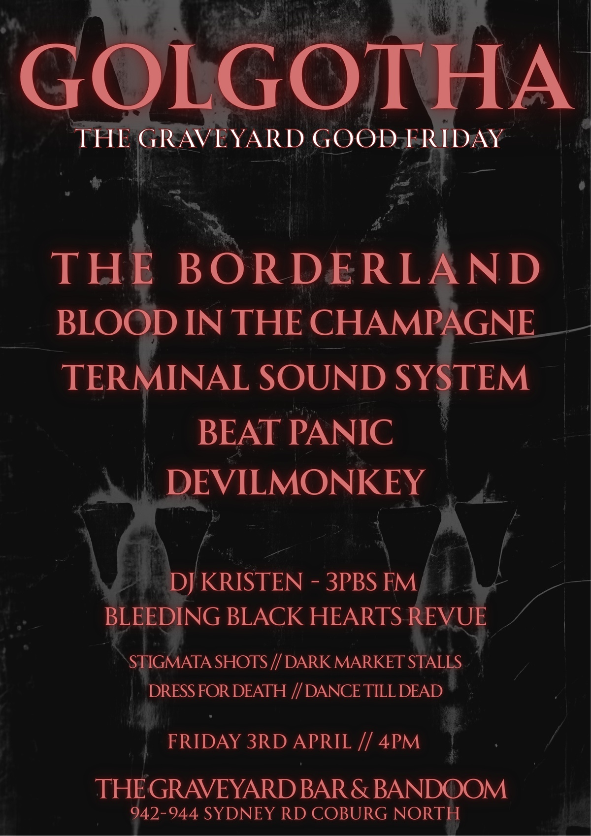Featuring death rock stalwarts The Borderland, etherial goth post punk from Blood In The Champagne, the spiky darkwave of Beat Panic, soundtracks to oblivion by legendary dystopic composer Terminal Sound System and the driving post punk of Naarm's DevilMonkey.