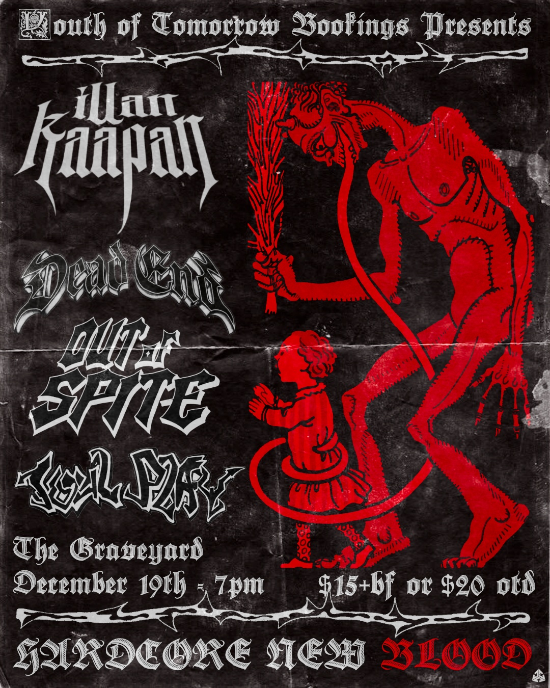 Showcasing Illan Kaapan, Dead End, Out of Spite and Foul Play at The Graveyard on Dec 19th.