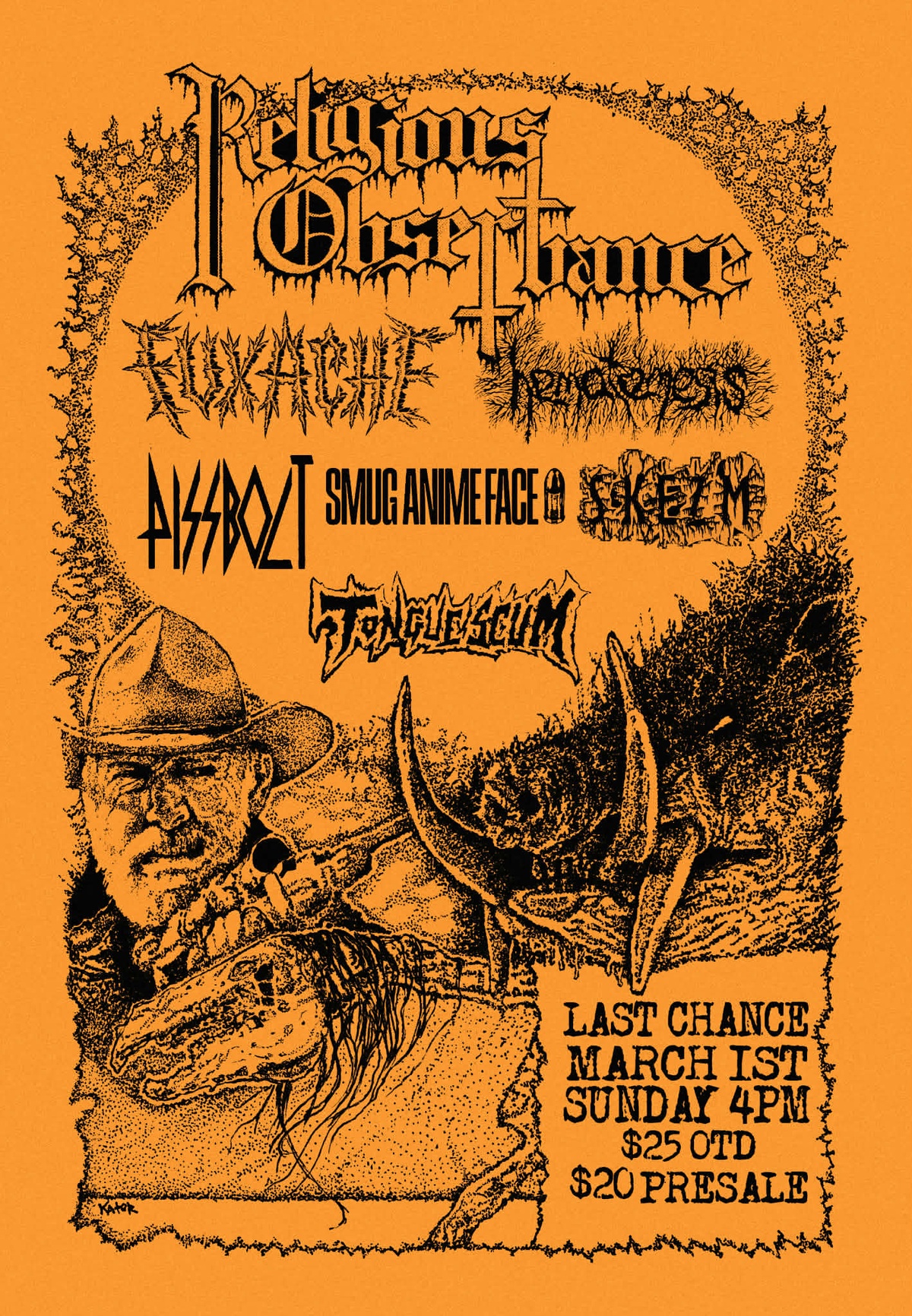 An Afternoon/Evening of Chaotic Bliss at the Last Chance Rock’n’Roll Bar, Naarm, as Religious Observance, FUXACHE (NT), Pissbolt, Hematemesis, Smug Anime Face (TAS), Skezm, and Tongue Scum serenade the willing at one of the country’s finest watering holes! Early Doors (4pm), Limited Capacity, Riffs, Beats, Growls, Shrieks, Mad Shit! Sunday, March 1st ’26