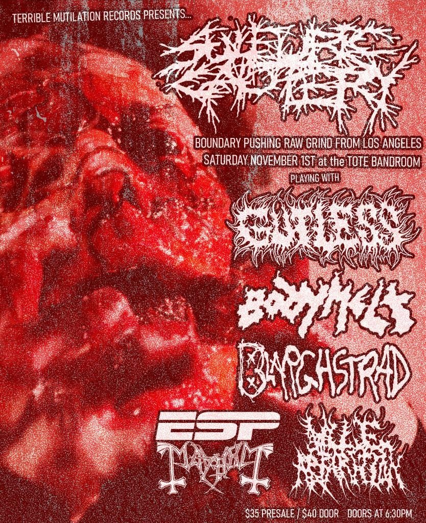 Terrible Mutilation Records presents Sulfuric Cautery from Los Angeles, boundary pushing raw grind, with supports Body Melt (NSW), Gutless, Vile Apparation, Blarghstrad and ESP Mayhem